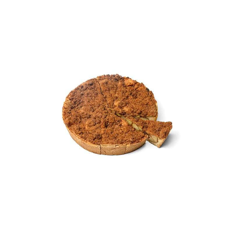 Roomboter appeltaart met een heerlijke kruimel, gemaakt van echte roomboter (26,1%) wenerdeeg met verse grote appelblokken en kaneel, afgewerkt met een heerlijke kruimel laag.