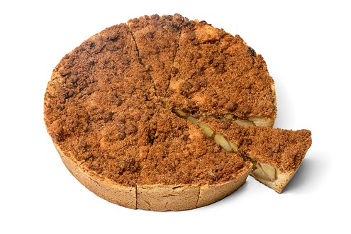Roomboter appeltaart met een heerlijke kruimel, gemaakt van echte roomboter (26,1%) wenerdeeg met verse grote appelblokken en kaneel, afgewerkt met een heerlijke kruimel laag. Gesneden in 12 punten